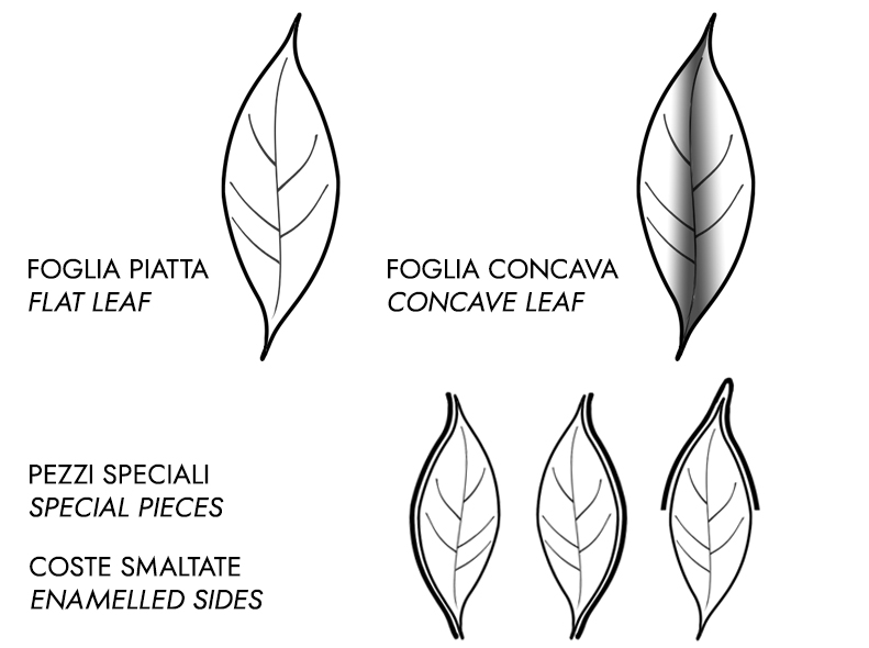 Traendo ispirazione dalla naturalezza del giardino la collezione foglie si avvale della irripetibilità dei pezzi fatti a mano, giocando inoltre sulla miscela della superficie planare e concava delle foglie che dona tridimensionalità e movimento.